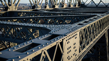 A stunning image of an industrial bridge showcasing its robust steel structure during sunrise, with sunlight beautifully reflecting on the water. The city skyline adds depth.