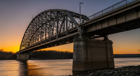 The metal trusses of the Milton-Madison Bridge, crossing the Ohio River between Madison, Indiana and Milton, Kentucky, are silhouetted by a colorful sunset sky.