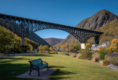 A scenic view of a large steel bridge arched over a valley with a bench in the foreground