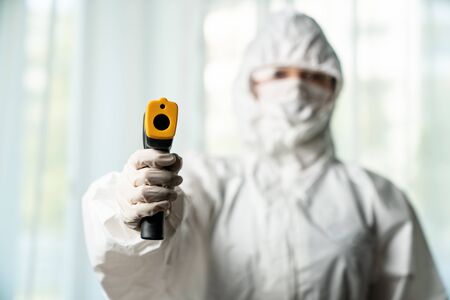 Female foreman wearing a mask measures the temperature for a worker in a safety suit. They stood and waited for the measurement with a non-contact infrared thermometer to prevent covid virus