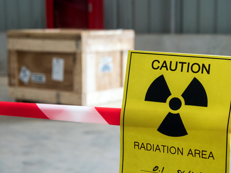 Radiation warning sign on the area warning tape around the Dangerous material package in the factory warehouse