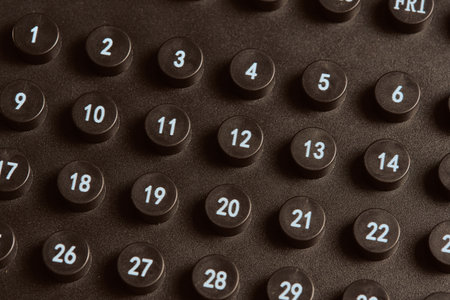 Close up of calendar day numbers. Black calendar with round numbers. Toned.