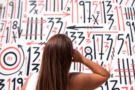 Fanzara (Castellón), Spain - September 20, 2020: Woman in front of graffiti of numbers and signs in Fanzara, town of Castellón (Spain). Part of MIAU (Unfinished Museum of Urban Art). Art concept
