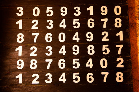 Flatley, side view on wooden numbers from zero to nine scattered randomly on wooden background