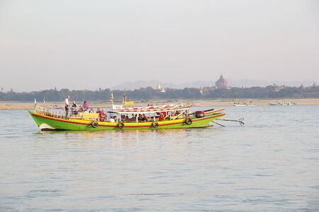 Traditional burmese boat with tourists along the Irrawaddy river in Bagan, Myanmar. Irrawaddy river flows from North to South in Myanmar. It is the Country largest river and most important commercial waterway.