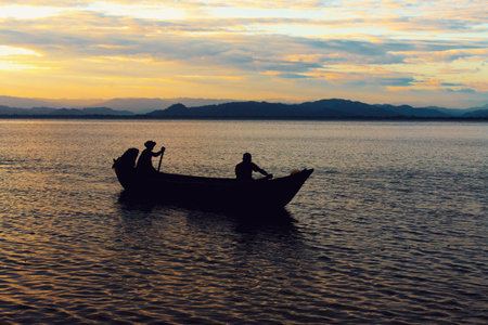 Fishermen in a boat on the river Irrawaddy in Mandalay, Myanmar, Burma. Copy space for text