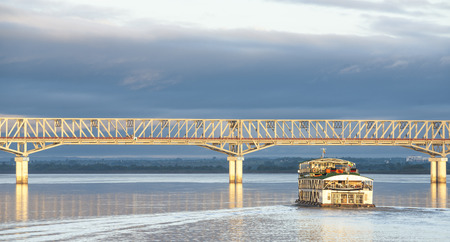 Khabarovsk, Russia - Aug, 14, 2021: Bridge over the Amur River in Khabarovsk, Russia. Evening photography
