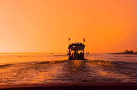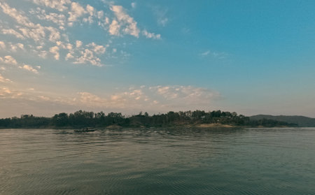 ship heading towards river island at dusk image is taken at peacock island guwahati assam india. it is showing the serene beauty of nature at dusk.