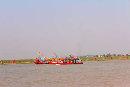 HAI DUONG, VIETNAM, March 2: Performed traditional boat on the Luc Dau river on March 2, 2013 in Kiep Bac Con Son festival, Chi Linh, Hai Duong, Vietnam. Kiep Bac Con Son festival is the most traditional festival, unique in Vietnam, held in spring and aut