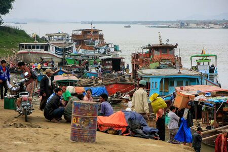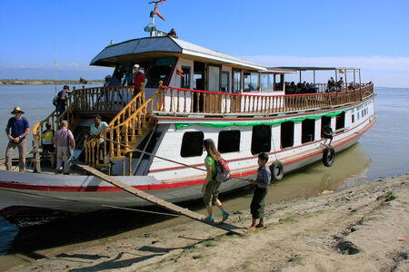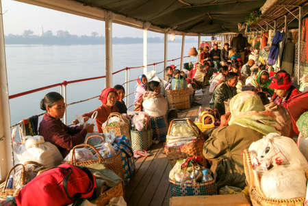 MANDALAY, MYANMAR - FEBRUARY 26, 2013: People on the ship leaves port of the Irrawaddi river.
