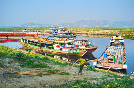 MANDALAY, MYANMAR - FEBRUARY 21, 2018: The cargo ships and barges are moored in port on Ayeyarwady river, the foggy hill of Sagaing with numerous shrines is seen on background, on February 21 in Mandalay.