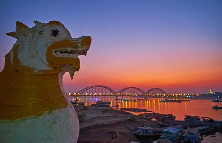 Panorama of Irrawaddy river from the Shwe Kyat Kya Pagoda with a view on sunset sky, sculpture of Chinthe lion and New Sagaing bridge on background, Mandalay, Myanmar