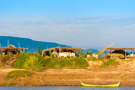 MANDALAY, MYANMAR - DECEMBER 1, 2016: The peasants working on the bank of the river Irrawaddy, Burma. Copy space for text