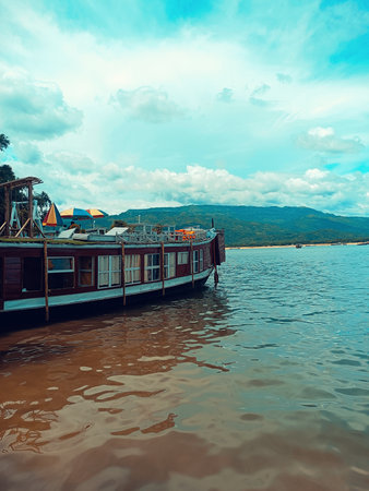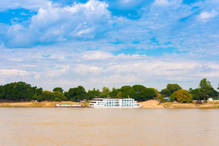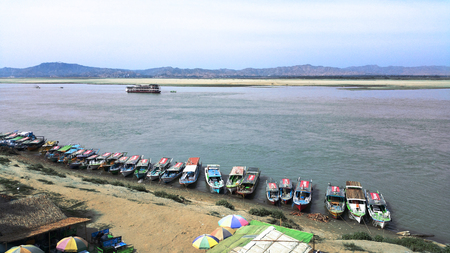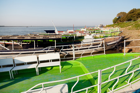 Tourist boat near the shore of the Irrawaddy river, Mandalay, Myanmar, Burma. Copy space for text