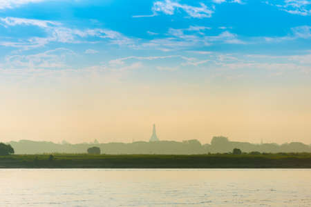 Buildings on the banks of the river Irrawaddy, Mandalay, Myanmar, Burma. Copy space for text