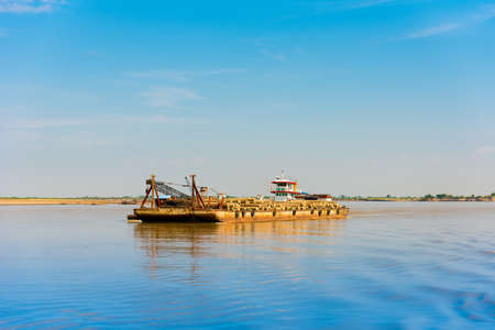 Cargo barge on the Irrawaddy river, Bagan, Myanmar, Burma. Copy space for text