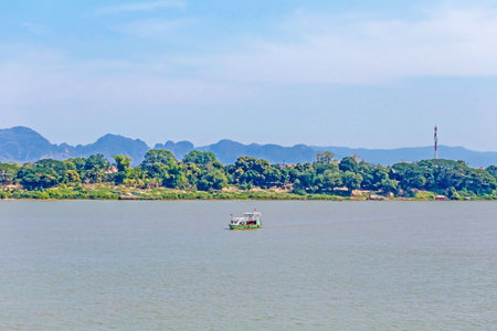 Tourist boat on the river Irrawaddy, Mandalay, Myanmar, Burma. Copy space for text