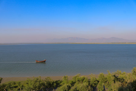 A tranquil view of the Naf River flowing between Bangladesh and Myanmar, featuring a traditional fishing boat, green shoreline, and distant mountains under a clear blue sky.
