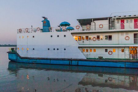 Bagan, Myanmar - Dec 6, 2014: Passenger boat in the Irrawaddy river in Myanmar. River lanscape at sunset.