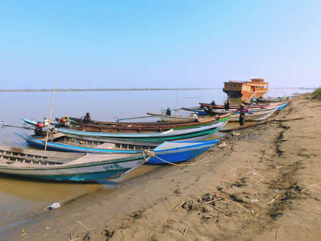 Several river boats are moored at the sandy bank of the Irrawaddy river in Nyaung U, Myanmar.