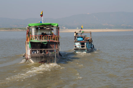 MANDALAY, MYANMAR - DECEMBER 21, 2016: Two tourist boats go along the Irrawaddy river Irrawaddy