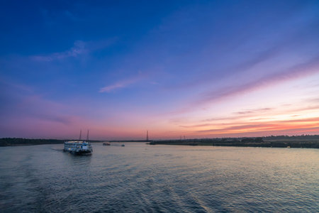 A large cruise ship glides along the tranquil Nile River near Esna Lock, Aswan, Egypt, at dusk. The sky above is painted with soft purple and pink hues, reflecting on the water.