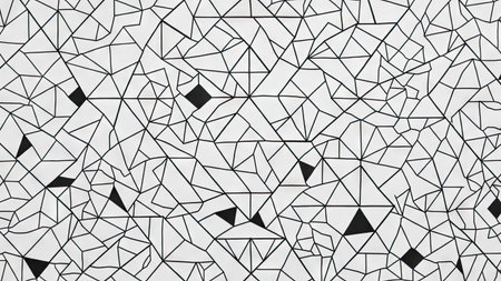 This black and white geometric pattern showcases a network of interconnected lines and shapes. The design features a repeating triangular and polygonal arrangement with varying line thicknesses. The composition creates a dynamic visual effect, suggesting movement and depth. This design is suitable for use in various graphic design projects.