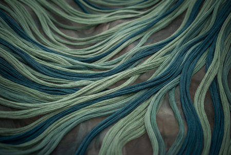 Detailed close up of smooth green and blue threads flowing together in wavy organic lines, resembling hair or water currents to create a soft abstract textile texture for design.