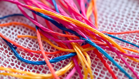 A vibrant and artistic close-up of brightly colored threads and fibers beautifully tangled together, showcasing texture and warmth for creative projects.