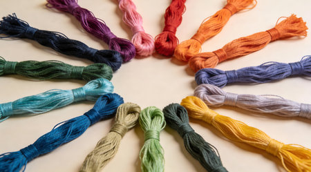 A vibrant collection of colorful threads in various hues, creating a beautiful and textured backdrop. Ideal for craft, textile, and design projects.