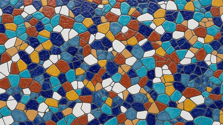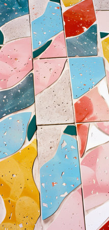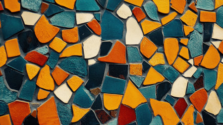 Textured surface featuring colorful fragments of stone and ceramic, arranged in mosaic pattern. vibrant colors include orange, yellow, red, and green, creating lively and artistic appearance