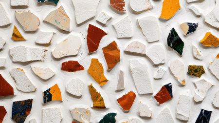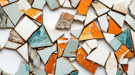 A captivating collection of colorful broken ceramic tiles arranged chaotically on a white surface, creating an intriguing abstract composition ideal for artistic backgrounds.