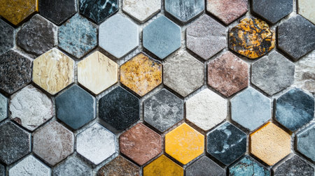Hexagonal tiles with varied textures and colors, forming an eye-catching mosaic pattern for interior design