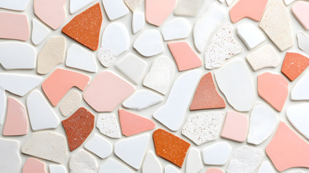 A vibrant, top-down view of a modern terrazzo mosaic featuring irregular geometric shapes in soft pastel pink, creamy white, and earthy terracotta orange, creating a stylish and contemporary background texture.