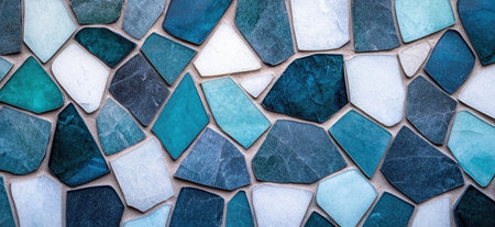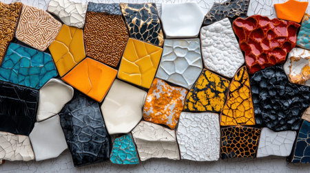 A captivating close-up shot of a vibrant mosaic wall, showcasing a stunning blend of textures and colors. Perfect for artistic and interior design projects.