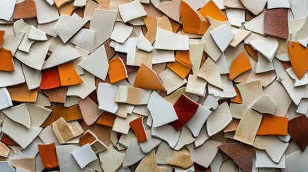A vibrant collection of shattered ceramic tiles featuring unique colors and textures. This artistic mosaic offers a lively backdrop for design inspiration and creative projects.