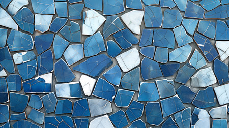 a design of blue and white mosaic tiles. There are little fragments of broken blue tiles.
