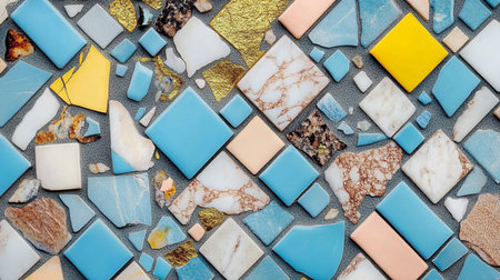 A vibrant mosaic tile pattern featuring diverse colors and textures, ideal for interior design projects, home decor, and artistic inspirations. Perfect for renovations or creative spaces.
