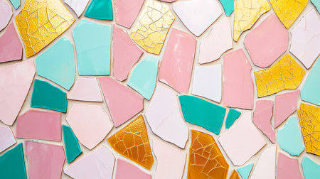 A closeup abstract texture of colorful broken ceramic tiles, creating a vibrant mosaic pattern with intricate details and varied shapes and colors