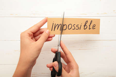 Impossible Is Possible Concept. card with the text impossible, cutting the word im so it written possible. Top view