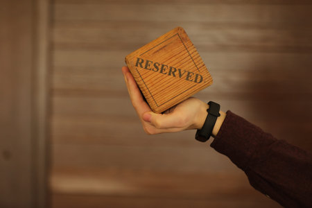 A wooden plaque has a word reserved . male hand holds a wooden plate with the inscription reserved isolated on a white background. selective focus