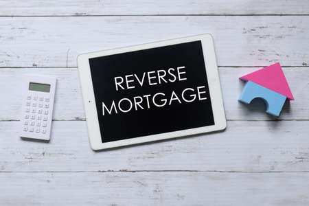 Top view of calculator,house model and tablet written with REVERSE MORTGAGE. Business and finance concept.