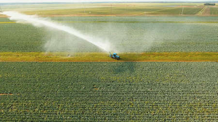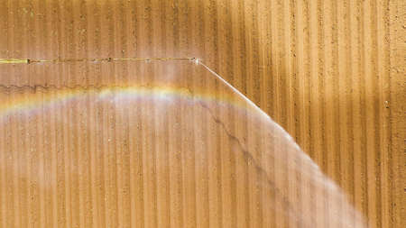 Aerial view by a drone of a potato field being irrigated by a gigantic and powerful irrigation system. High quality photo