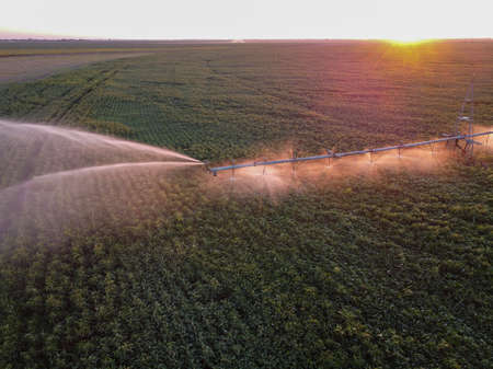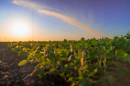 Irrigation system watering a crop of soy beans at field