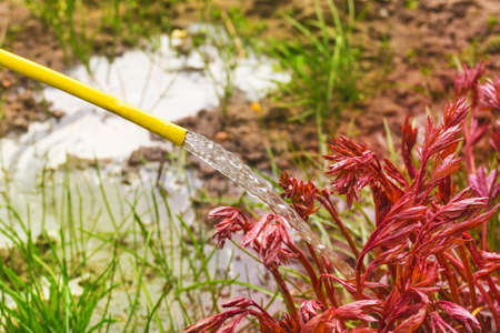 Watering flowers on a flowerbed. Water pours from hose on growing flowers peonies, close-up.