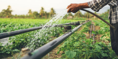 Farmer hand holding a hose. Watering fresh green crops in an agricultural field with an irrigation system. Highlighting sustainable farming practices. Food production. And diligent agricultural labor