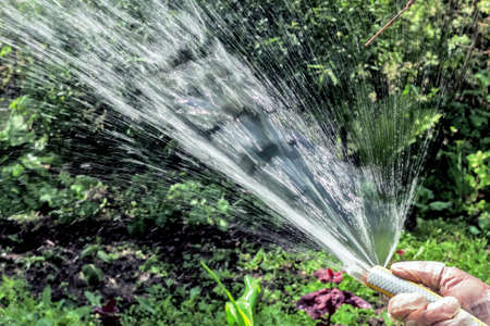Jet of water from hose to water sunny garden