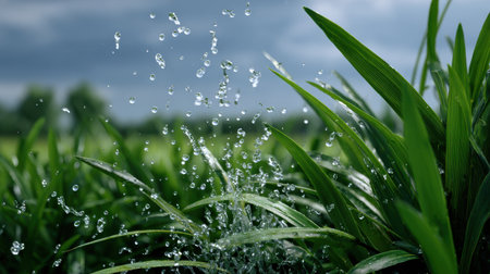 A serene scene of water droplets nourishing vibrant grass in a tranquil landscape.