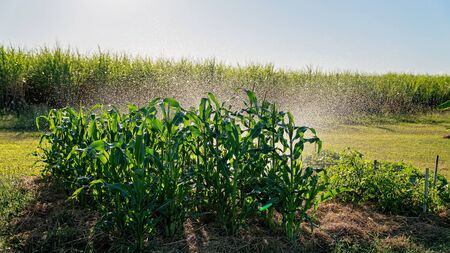 A healthy crop of corn in a rural backyard garden being watered with a sprinkler in late afternoon sunlight