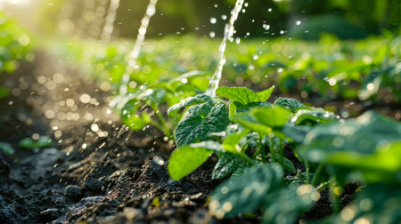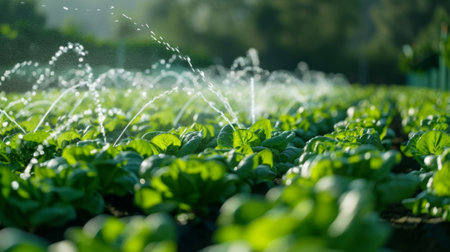 This captivating image features vibrant green plants receiving refreshing water droplets, highlighting the beauty of agriculture in early morning light.